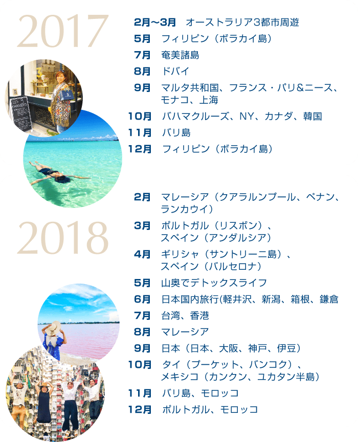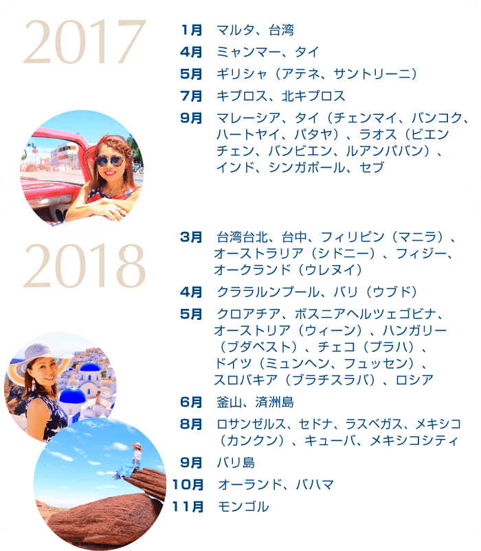 - 主婦、OL、シングルマザー・・・ビジネスの経験有無、年齢、経済状態問わず、旅を仕事に、月1海外を実現してきた王道の3つのステップについて詳しくお伝えします。