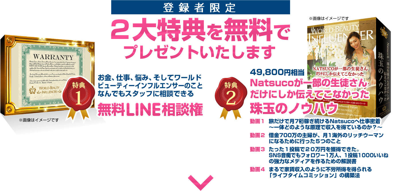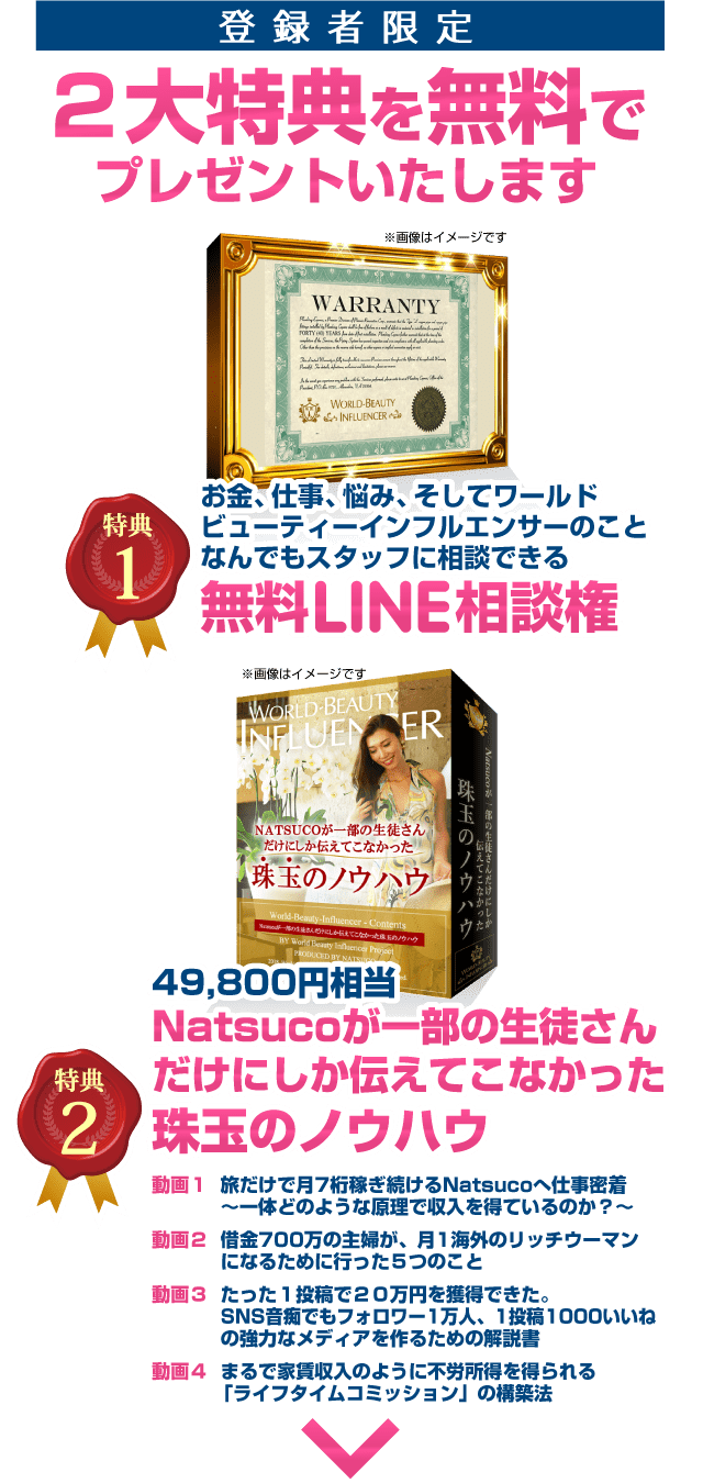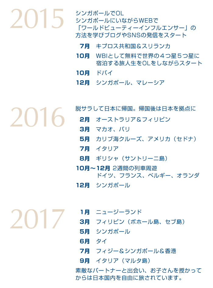 海外旅行へ行ったり、自分の趣味などをインスタグラム、フェイスブック、ブログなどのSNSで発信することで、複数の安定的な収入を得ることができる職業。 また「ワールドビューティー・インフルエンサー」になることで世界の5ツ星ホテルに無料招待されたり、飛行機(ビジネスやファーストクラスも。)にタダで乗ることもできるようになります。